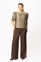 Блузон из уютного трикотажного полотна, свободного прямого силуэта. Линия плеча спущена, рукав прямой, на зауженной манжете. Линия плеча состоит из притачного элемента: погона. Рукав основной состоит из двух деталей, в горизонтальном шве стачивания данных деталей расположен открытый разрез. По верхнему срезу расположены стразы. При желании длина рукава может трансформироваться и отверстием выступает открытый разрез. Длина рукава вместе с плечевой линией 75 см. Из них 13 см: длина плеча и 62 см: длина рукава. Высота манжета 5 см. На центральной части переда блузона расположены декоративные аппликационные элементы, в виде ассиметричных полос из пайеток. Горловина округлая, оформлена притачной планкой, высотой 3 см. Низ блузона оканчивается притачной манжетой, высотой 6 см. Длина блузона по спинке изделия 70 см.