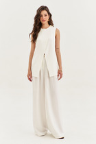 Стильный комплект, состоящий из удлиненного жилета, короткой прямой юбки и майки. Жилет прямого силуэта с вертикальными рельефами по полочке и накладными карманами без подкладки. Горловина жилета округлая с лацканами без воротника. Застежка вертикально-фронтальная на петли-пуговицы. Длина жилета по среднему шву спинки 83 см. Юбка комплекта прямого силуэта, спереди имеет карманы с наклонным входом. В среднем шве спинки расположена застежка-молния и небольшой открытый разрез. В боковых швах юбки вставлены полосы-лампасы, шириной 2,8 см из этой же ткани, но с расположением принта, выкроенным «по косой». Данные лампасы по рисунку кроя перекликаются с карманами жилета. Длина юбки 50 см. Майка комплекта свободного покроя с округлым вырезом и коротким рукавом. Длина майки 64 см. Длина рукава 26 см.