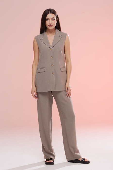 Стильный комплект, состоящий из прилегающего жилета на подкладе и свободных брюк. Жилет прилегающего силуэта на подкладе, однобортный, с классическими вертикальными рельефами. Изделие дополнено отложным воротником, функциональными карманами в рамку с клапанами и вертикальной фронтальной застежкой на 4 пуговицы, длина жилета по спинке-70 см. Брюки комплекта прямого силуэта. В боковых швах расположены внутренние наклонные карманы. Пояс со вставленной эластичной тесьмой, шириной 3 см. и дополнительным шнуром-кулисой для четкой фиксации объема талии. Длина брюк по боковому шву-113 см. Рост: 164-174