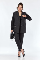 Брюки современного силуэта. Карманы-хулиганы расположены в боковых швах. На задней части брюк расположен ложный карман-листочка. Фронтальная застежка на клапан-молнию (гульфик) и пуговицу. Для дополнительной фиксации объема талии спереди расположены полупояса с пряжкой из полуколец. На линии талии переда, также расположены складки-защипы для свободы входа в карман. На передних полотнищах брюк внизу заложены две модельные складки для уменьшения ширины низа изделия. Оканчиваются брюки деликатным отворотом, шириной 2,5 см. Длина брюк по боковому шву с отворотом 99 см.