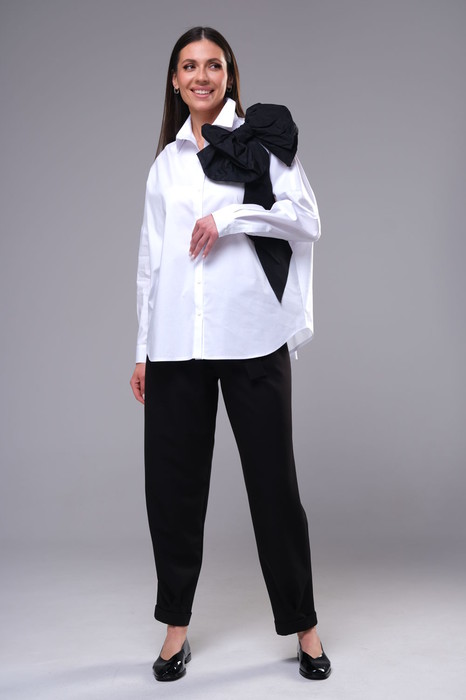 Элегантный комплект в классических черно-белых тонах, состоящий из свободной блузы рубашечного кроя и современных брюк.