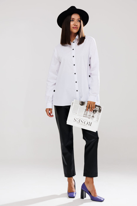 Спинка состоит из горизонтальной кокетки и основной детали, на которой расположены две складки для свободы движения. Линия низа: фигурная. Рукав втачной, одношовный, с притачной манжетой, высотой 5,5 см и разрезом-планкой для петли/ пуговицы. Высота планки 11 см. Длина рукава в готовом виде 61 см. По бокам блузы расположены декоративно-функциональные планки с застежкой петли/пуговицы. Фурнитура (пуговицы): контрастного черного тона с основным изделием.
