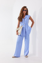 Костюм женский из гладкокрашеного тканого полотна «штапель» состоящий из блузы и брюк в единой цветовой гамме.
