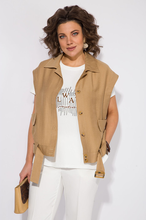 Эффектный и неординарный комплект, в стиле «casual». Модель состоит из свободной жилетки песочного оттенка и молочной футболки с печатью. Жилетка со спущенным плечевым швом; с отложным воротником. Застежка центральная на петли и пуговицы с планкой. По полочке расположены накладные карманы с имитацией клапана. По низу предусмотрен съёмный пояс с декоративной пряжкой в тон изделию. Спинка без особенностей. Футболка в комплекте с округлым вырезом горловины и боковыми разрезами по низу. Рукав вточной, укороченный. Данный комплект отлично сочетается с различными элементами гардероба, подчеркивая ваш уникальный стиль и вкус. Подойдет в комплекте с базовыми брюками из коллекции от бренда LILIANA под арт. М-БрЛ!