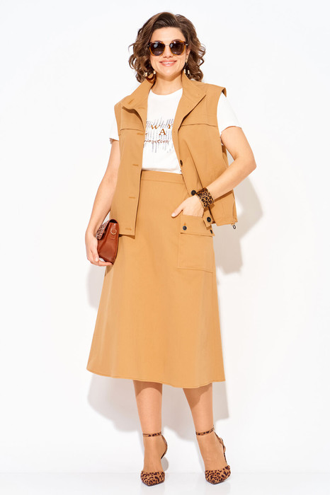 Модный женский костюм из джинсы идеально подойдет для создания стильного образа. Этот костюм включает жилетку в стиле оверсайз на юбку-А-силуэта, что делает его универсальным вариантом для повседневных прогулок! Жилетка на шелковой подкладке с боковыми карманами в рельефах. Воротник стойка с центральной застежкой на петли и пуговицы с подбортом. Низ жилетки можно присборить на кулиску. Юбка в костюме на притачном поясе, в боковых участках вставлена резинка. Юбка с накладными карманами; застежка молния в среднем шве спинки. Джинсовый костюм с юбкой — это универсальная одежда для повседневной жизни, отдыха и прогулок. Он подходит для женщин разных возрастов и типов фигур, позволяя каждой представительнице прекрасного пола выглядеть стильно и чувствовать себя уверенно.