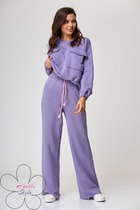 Костюм выполнен из двух видов ткани: костюмно-плательного материала и эко кожи. Жакет слегка приталенного силуэта с центральной бортовой застежкой на 2 петли и пуговицы. Воротник пиджачного типа с отложными лацканами. По переду обработаны прорезные карманы с клапаном. Рукава втачные, двухшовные. Жакет на подкладке. Брюки зауженные к низу. На передних половинках брюк боковые карманы «хулиганы». Верхний срез брюк на притачном поясе, на резинке со шнуром из основной ткани.