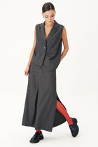 Комплект состоит из платья и укороченного жакета. Платье отрезное по линии талии, выполнено из двух видов ткани. Нижняя часть платья выполнена из шифона на трикотажной подкладке. В боковом шве потайная молния. Жакет длинной чуть ниже линии талии. Воротник стояче отложной, рукав втачной одно-шовный, центральная застёжка на петли и пуговицы. Низ жакета на притачном поясе.