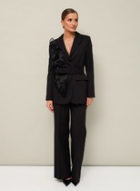 Блузка свободного кроя со спущенной линией плеча. Воротник рубашечного типа на отрезной стойке, центральная застёжка на петли и пуговицы. Низ блузки по спинке и переду собирается на кулису, которая может регулироваться по ширине. Рукав втачной, низ обработан притачной манжетой с застежкой на петлю и пуговицу. Брюки свободного кроя, на притачном поясе с эластичной тесьмой и потайным шнуром из основной ткани. В боковых швах карманы “ хулиганы”.