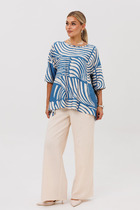 Брюки на притачном поясе. Пояс частично на резинке. Передние половинки с наклонными карманами к боковым швам.  Брюки с разрезами по шаговым швам.