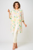 Блуза с фигурным вырезом горловины. Перед с фигурной деталью длиннее низа, складками с одной стороны, декоративной тесьмой и цветком из ткани. Спинка с потайной молнией в среднем шве и талиевыми вытачками. Рукава втачные.