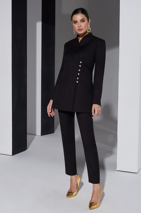Дизайнерский брючный костюм со смещенной застежкой отличный выбор для ценителей минимализма и строгого стиля. Универсальный комплект впишется в любой гардероб и подойдет на все случаи жизни, подходит для шпилек и обуви на плоском ходу. Вещи из этой капсулы легко сочетать с другими вещами, базовые черные брюки отлично будут смотреться с белой рубашкой, а удлиненный жакет можно носить как легкий плащ с платьем или юбкой. Удлиненный жакет с цельнокроеной стойкой и смещенной застежкой, застегивается на воздушные навесные петли. Перед и спинка с подрезами ниже груди и талии оформлены декоративными отстрочками. Рукав втачной с отлетной шлицей. Базовые брюки с косыми карманами заужены к низу. Застежка обработана по классической технологии (гульфик с молнией и пуговица на поясе). Вся обработка выполнена как в классических итальянских костюмах. Жакет на подкладке. На обтачке спинки жакета выполнена аккуратная вышивка.