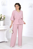 Жакет с фигурным вырезом горловины, двубортной застёжкой на петли и пуговицы и отрезной баской. Изделие со съёмным поясом. Перед с карманами с клапанами в нижнее части. Спинка со средним швом и двумя рельефами до баски. Рукава втачные.