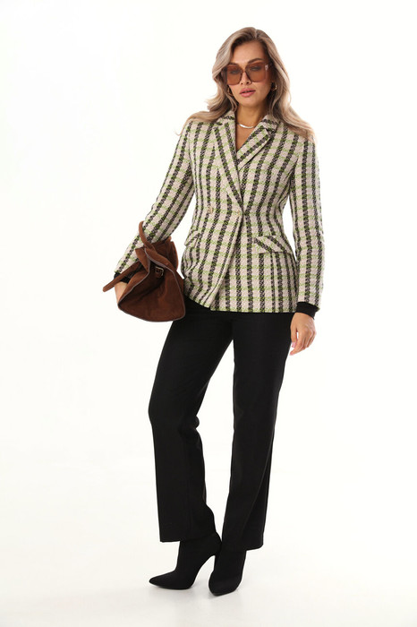 Комлект 2ка состоит из жакета и брюк. Жакет двубортный умеренного объёма из твидовой мягкой ткани. Застёжка на две пуговицы. По бокам расположены функциональные прорезные карманы с клапаном. Жакет на подкладке. Брюки среднего объема, слегка зауженного силуэта от бедер. На передних половинках с обеих сторон расположены под наклоном функциональные карманы. На задних половинках расположены вытачки. Пояс отрезной. На поясе расположены шлевки и отделочные паты. Застежка брюк – гульфик на молнии, на поясе крючок. Длина жакета по спинке 70-71 см. Длина брюк 109-110 см.