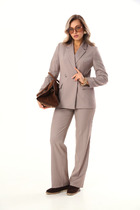 Комплект 2-ка, состоящий из укороченного бомбера и брюк. Бомбер с застёжкой на молнию и объёмными рукавами. Линия талии на кулисе и завязке из основной ткани.Брюки широкого объема, прямого силуэта. На передних половинках брюк заутюжены стрелки, переходящие в складки по линии талии. На задних половинках также заутюжены стрелки. В боковых швах расположены карманы. Застежка-гульфик. Пояс отрезной, притачной. В задней части пояса вставлена эластичная тесьма (резинка). На пояс настрочены шлевки. Выступающая часть пояса застегивается на петлю и крючок.