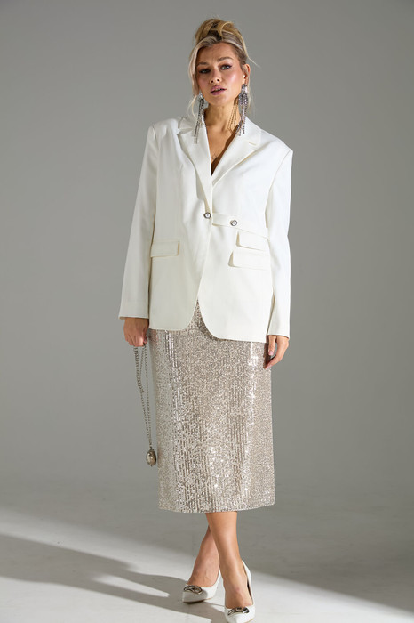 Комплект 2-ка, состоящий из жакета и юбки. Жакет однобортный объёмного силуэта с расширенным плечевым поясом. Застёжка на одну пуговицу. Из бокового шва выходит декоративная пата. По полочки распложены три прорезных кармана с клапанами, два из которых функциональные. Юбка- карандаш длиной ниже колена прямого силуэта. Пояс юбки и подкладка выполнены из эластичного трикотажа. Верхний слой юбки из лёгкой ткани расшитой пайетками. Застёжка на потайную молнию в среднем шве по спинке, разрез расположен внизу среднего шва.