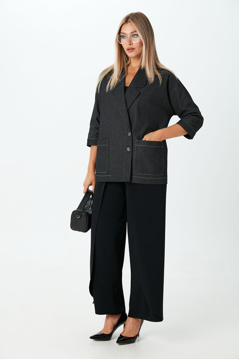 Комплект 2ка, состоящий из жакета и брюк. Жакет большого объёма с двубортной застежкой по одной стороне на петли и пуговицы. Рукава 3/4 с манжетами. Жакет без подкладки. По переду расположены накладные карманы. Длина жакета по спинке 70-72 см. Широкие брюки-кюлоты свободного оригинального кроя с застёжкой на запах на петли и пуговицы. Без карманов.