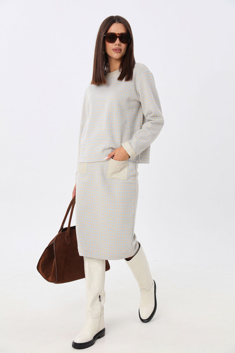 Трикотажный костюм 2ка , состоящий из джемпера и юбки. Джемпер прямого кроя свободного силуэта. Горловина и манжеты низа рукавов декорированы экокожей. Юбка-карандаш длиной ниже колена. По переду расположены карманы из мягкой экокожи.  Рост фотомодели 175 см. Размер у фотомодели – 44.
