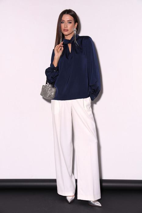 Комплект 2ка, состоящий из блузки и брюк. Блуза из плотной струящейся ткани с атласным эффектом объёмного кроя с воротником-стойкой и сборкой по горловине. Манжеты с застёжкой на две пуговицы, легкая сборка по низу рукавов.  Брюки широкого объема, прямого силуэта. На передних половинках брюк заутюжены стрелки, переходящие в складки по линии талии. На задних половинках также заутюжены стрелки. В боковых швах расположены карманы. Застежка-гульфик. Пояс отрезной, притачной. В задней части пояса вставлена эластичная тесьма (резинка). На пояс настрочены шлевки. Выступающая часть пояса застегивается на петлю и крючок.