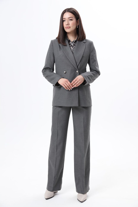 Костюм 2ка, состоящий из жакета и брюк.  Жакет двубортный умеренного объёма  приталенного силуэта с застёжкой на петли и пуговицы. По бокам расположены функциональные прорезные карманы с клапаном.  Жакет на подкладке.   Брюки умеренного объема, прямого силуэта. На передних половинках брюк заутюжены стрелки, переходящие в складки по линии талии. На задних половинках также заутюжены стрелки. По бокам расположены функциональные карманы. Застежка-гульфик. Пояс отрезной, притачной. На пояс настрочены шлевки. Пояс застегивается на петлю и крючок.                                                                                                                                                                 Рост фотомодели 175 см. Размер у фотомодели – 44.                             СОВЕТ  ОТ СТИЛИСТА: для прохладных дней надевайте под жакет водолазку , а из обуви можно подобрать кеды или ботинки на платформе. Для более романтичного образа советуем укомплектовать блузкой из нашей коллекции , а из обуви подобрать ботильоны на каблуке.