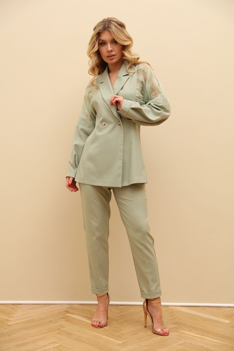 Двубортный жакет полуприлегающего силуэта с застёжкой на две пуговицы без карманов. Рукава жакета объёмные, заканчиваются манжетой с застёжкой на пуговицу. В качестве декора  в районе плеча присутствуют вставки из полупрозрачной ткани в цвет костюма.