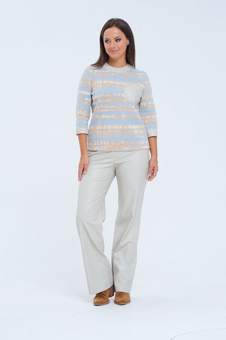 Комплект 2ка, состоящий из джемпера и брюк. Трикотажный джемпер свободного кроя с укороченными рукавами. По переду расположен карман из мягкой экокожи. Горловина и манжеты низа рукавов декорированы экокожей. По переду нагрудные вытачки. Застёжка на потайную молнию по спинке.  Прямые брюки из мягкой экокожи с мягкой вискозной изнанкой, очень приятной к телу. По переду и сзади расположены карманы по принципу джинсовых брюк. Застёжка на молнию и пуговицу.