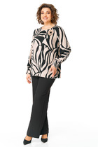 Комплект 2ка, состоящий из рубашка и брюк. Рубашка женская большого объема, прямого силуэта. На детали спинки расположена двойная кокетка, переходящая на деталь полочки. Под кокеткой на спинке встречная складка. Воротник рубашечный отложной на стойке. Застежка планка центральная на прорезные петли и пуговицы. Линия плеча спущенная, рукав рубашечный, длинный. В нижней части рукава заложены складки, заканчивается манжетой с двумя прорезными петлями и пуговицами. Низ блузки разноуровневый: спереди короче, сзади длиннее.   Удобные повседневные брюки из лёгкой ткани с вискозой в составе. Брюки свободного прилегания по бедрам и зауженные к низу. Пояс на эластичной тесьме с кулисой и втянутым шнурком. Вход в карман фигурный, наклонный к боковому шву. Рост фотомодели 175 см. Размер у фотомодели – 44.
