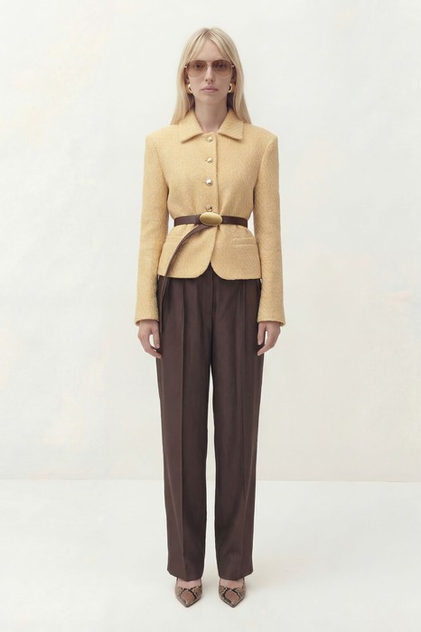 Жакет полуприлегающего силуэта с центральной застежкой на петли и пуговицы. Край борта фигурной формы. Рукав втачной длинный со шлицей. На шлице рукава пуговица. Воротник рубашечного кроя. По спинке средний шов и рельефы. Брюки свободного кроя, прямого силуэта, на притачном поясе. По переду глубокие складки, в боковых швах прорезные карманы. По задней половине брюк талевые вытачки. К комплекту прилагается съемный пояс коричневого цвета.