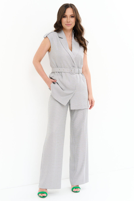 Элегантный комплект из удлиненного жилета и широких стильных брюк. Комплект выполнен из мягкой костюмной ткани. Однобортный жилет полуприлегающего силуэта с отложным воротником, на подкладке, с центральной застежкой на пришивные потайные кнопки. Воротник отложной. Жилет дополнен удобными карманами. Притален за счет съемного пояса, выполненного из основной ткани (в комплекте). Широкие брюки прямого кроя с притачным поясом, с застежкой на пришивную пуговицу и молнию. Посадка слегка завышена. Дополнены функциональными боковыми карманами.Длина жилета от плечевого шва 87 см. Длина брюк по боковому шву 109 см