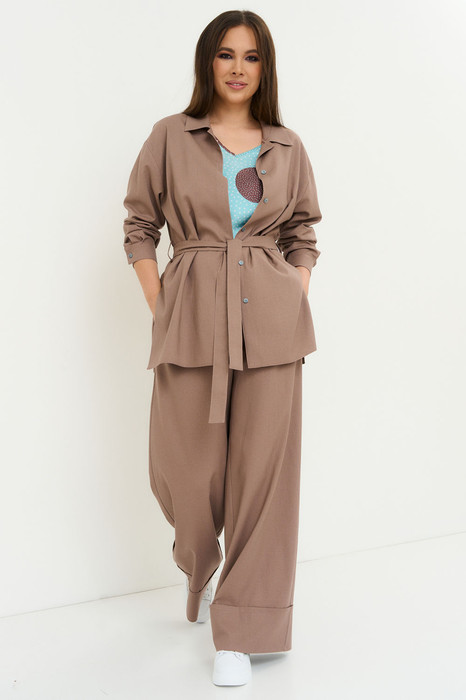 Стильный и комфортный льняной комплект из блузы, топа и брюк. Льняная блуза рубашечного кроя с отложным воротником и центральной застежкой на пришивные пуговицы. Рукав длинный , спущен, с притачной манжетой. Топ прямого кроя с цельнокроеным коротким рукавом. Широкие льняные брюки свободного прямого кроя , с притачным поясом, дополненным эластичной тесьмой. По бокам расположены удобные карманы. По низу брюки с широким подворотом. Застежка на молнию и пришивную пуговицу. Длина блузы от плечевого шва 77 см. Длина рукава 60см. Длина топа от плечевого шва 60 см. Длина брюк по боковому шву 106 см.