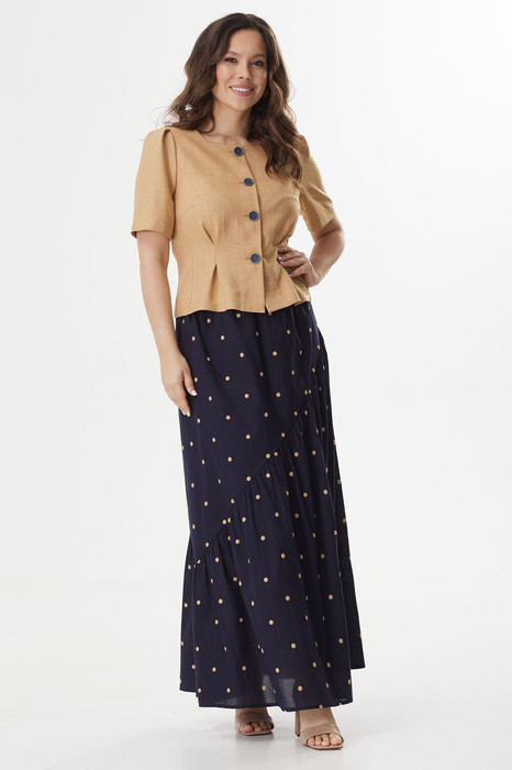 Элегантный костюм из легкого жакета и юбки. Жакет полуприлегающего силуэта с центральной застежкой на пришивные пуговицы. Выполнен из комфортной поливискозной ткани. Горловина округлой формы Рукав втачной, длина выше локтя. Юбка А-силуэта на хлопковой подкладке, по талии дополнена эластичной тесьмой. Выполнена из хлопоковой ткани. Длина жакета от плечевого шва 53 см. Длина рукава 30см. Длина юбки 95см.