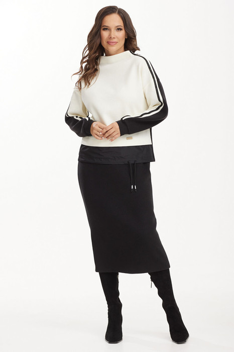 Стильный трикотажный костюм  из джемпера и юбки. Выполнен из качественного,  приятного к телу  трикотажного полотна. Джемпер прямого свободного кроя. Рукав втачной, слегка спущен, дополнен притачной манжетой. Горловина -стойка цельнокроеная. Перед  джемпера выполнен из коричневого трикотажа, спинка - из черного. Спереди джемпер дополнен притачной планкой с кулиской по низу. Юбка миди с боковым разрезом. По талии эластичная тесьма. Выполнена из черного трикотажа. Юбка дополнена из комфортной трикотажной подкладкой.  Длина джемпера от плечевого шва 63см. Длина рукава60см. Длина юбки85см.