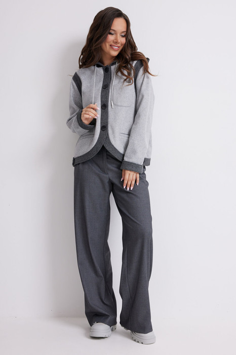 Стильный комплект из бомбера и брюк. Бомбер свободного кроя, без подкладки, с центральной застежкой на пришивные пуговцы. Выполнен из плотного трикотажного полотна, напоминающего пальтовую ткань с мягкой и комфортной изнанкой. Тактильно приятный, уютный и теплый бомбер дополнен капюшоном.  Рукав втачной, слегка спущен. Бомбер может использоваться самостоятельно, или под верхнюю одежду. Брюки прямого кроя с притачным поясом, дополненным эластичной тесьмой. Выполнены из комфортной костюмной ткани. Посадка средняя. Застежка гульфик на молнию и пуговицу. Дополнены функциональными боковыми карманами и накладными задними. Брюки дополнены шлевками для пояса. Длина бомбера от плечевого шва 65см.  Длина рукава 60см.  Длина брюк по боковому шву 108см