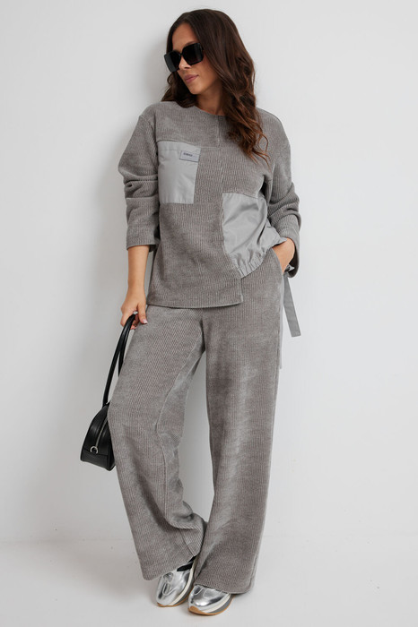 Стильный костюм из джемпера и брюк. Выполнен из фактурного трикотажного полотна (штрукс) в комбинации с красивой мягкой плащевой тканью. Джемпер свободного кроя с застежкой по спинке на кнопки. Рукав слегка спущен. По низу джемпер дополнен красивой сборкой на эластичную тесьму и завязывается в красивый бант. Брюки прямого свободного кроя, с притачным поясом, дополненным эластичной тесьмой. Посадка средняя. По бокам брюки дополнены удобными карманами. Длина спинки 69см. Длина брюк по боковому шву 104см.