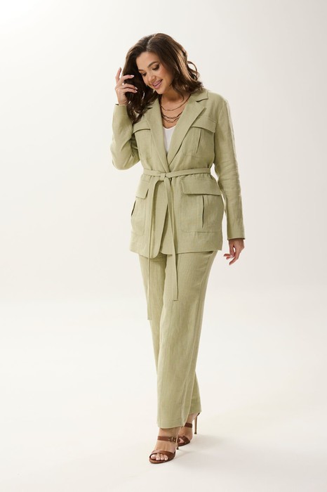 Комплект женский, состоящий из жакета и брюк. Жакет полуприлегающего силуэта, рукав длинный втачной, спинка со средним швом. По переду накладные карманы со складкой и клапаном. Пояс в комплекте. Брюки прямые на резинке по спинке, по переду рельефы, на задней половине вытачки.