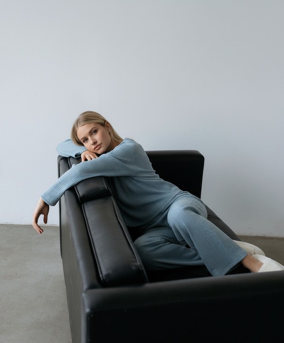 Костюм молодежный из гладкокрашеного фактурного трикотажного полотна, состоящий из джемпера и брюк. Джемпер – прямого силуэта, свободная, с цельнокроеными длинными рукавами , горловиной овальной формы, обработанной втачной планкой.Брюки – свободного кроя, длинные, с эластичной тесьмой по талии и шнурком, продетым в две обметанные петли.