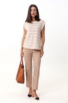 Костюм женский в комбинации двух видов полотен: из гладкокрашенного трикотажного вискозного полотна с эффектом «варенка», состоящий из футболки и брюк. Футболка - свободного покроя, с короткими цельнокроеными рукавами, горловиной V-образной формы, окантованной основным материалом и разрезами в боковых швах. Модной деталью является разница длин между полочкой и спинкой.Брюки – длинные, свободные, на притачном поясе с эластичной тесьмой внутри.