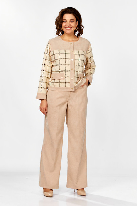 Женский комплект полуприлегающего силуэта, выполнен из штруксовой ткани и замши с принтом. Жакет выполнен из замши с принтом, застежка по переду, на планку с кнопками, горловина округлой формы, на обтачке, обтачка и планка из штрукса. Также на полочке обработаны кокетки из штрукса, также на полочке обработаны клапаны из штрукса, низ жакета обработан притачной планкой из штрукса. Спинка также с кокеткой из штрукса, рукав втачной, длинный, по низу на манжете из штрукса. Брюки выполнены из штрукса, прямого покроя, верхний срез обработан притачным поясом. Застежка по переду на молнию-пуговицу, в боковых швах карманы. Стильный комплект отличный выбор для осеннего образа!