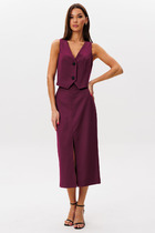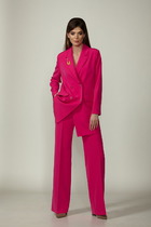 Костюм состоит из жакета и брюк. Жакет на подкладке с прорезными функциональными карманами по переду и застежкой на 2-е петли и пуговицы. Рукав втачной двухшовный со шлицей декорированной пуговицами. Брюки прямые от линии калена с застежкой спереди на молнию. Пояс с резинкой по бокам. Длина жакета 71 см, длина рукава 60 см, длина брюк 102 см
