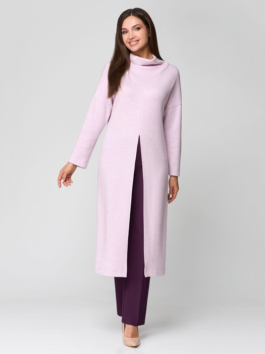 Комплект состоит из удлиненной туники и брюк. Туника из мягкого  теплого трикотажного полотна со швом по переду и удлиненым разрезом. Линия плеча спушенна, рукав одношовный, воротник стойка. Брюки прямые от линии калена, застежкой в боковом шве на потайную молнию. Длина туники 115 см, длина рукава от плеча 66 см. длина брюк 108 см