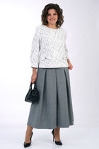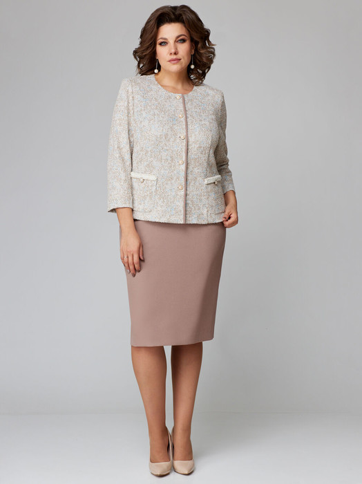 Элегантный и стильный комплект состоящий из жакета и юбки. Жакет слегка приталенного силуэта горловиной круглой формы и с застежкой на 5 петель и пуговиц. По переду жакета накладные карманы с декоративной тесьмой и пуговицей. По краю борта контрастная отделка в цвет юбки . Рукав втачной двухшовный. Спинка со средним швом и талиевыми вытачками. Юбка прямая, слегка зауженная к низу, на подкладке с притачным поясом, для максимального комфорта в поясе по бокам предусмотрена резинка. По спинке в среднем шве разрез и застёжка на молнию. Длина жакета 58 см, длина рукава 54 см, длина юбки 68 см