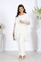 Комплект женский , двух предметный состоящий из туники и брюки. Туника прямого силуэта выполнена из трикотажного полотна « в полоску» . Горловина переда обработана довязом , горловина спинки обтачкой. Линия плеча спущена . По переду с правой стороны авторская печать. Рукав втачной, одношовный. Длина изделия по спинке- 65см, длина рукава от горловины – 66 см. По бокам имеются разрезы. Брюки палаццо прямого силуэта на притачном поясе, с застежкой на тесьму- молнию и 1 пуговицу и петлю, с боковыми наклонными карманами на передних половинках брюк . По передним половинкам брюк прострочены 2 канта. Для лучшего прилегания брюк в области талии в поясе со стороны спинки вставлена резинка. Длина брюк по боковому шву без пояса- 104 см.