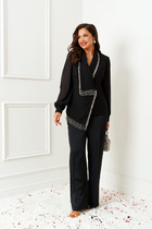 Элегантный женский комплект трехпредметный, состоящий из блузки, топа, брюк. Блузка прямого силуэта. Левая полочка выполнена из отделочной ткани в полоску. Рубашечный воротник.  По правой планке настрочен декоративный серебристый кант. Спущенная линия плеча. Спинка цельнокроеная.  Рукав одношовный по пройме и по низу рукава прострочен кант. Низ блузки фигурный с разрезами по бокам. Застежка по планке на 7 пуговиц и петель. Длина изделия по боковому шву (без пояса) -102см
