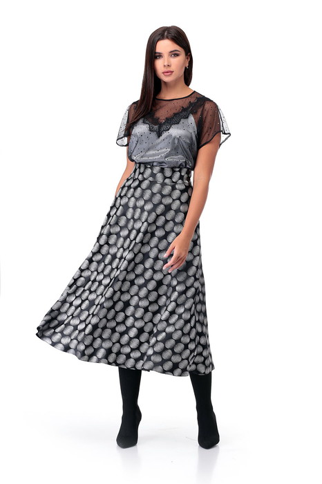 Топ из нарядной сетки в горошек со спущенным рукавом , на довязе украшен кружевом. Застежка на спинке на петлю,пуговицу Длина по спинке-54см..Юбка-колокол на подкладке с широким поясом с застежкой на 2 петли,пуговицы и молнию. Длина юбки-85см.