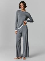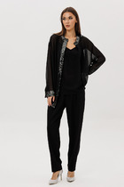Костюм женский, состоит из блузы и брюк. Блуза прямого силуэта. Застежка центральная на 2 петли-пуговицы. воротник пиджачного типа. Блуза без карманов. Рукав внизу на пате, в боковых швах блузы - разрезы. Брюки прямые на резинке со шнурком, свободные, прямые, с боковыми карманами. Дополняет костюм съемный пояс.