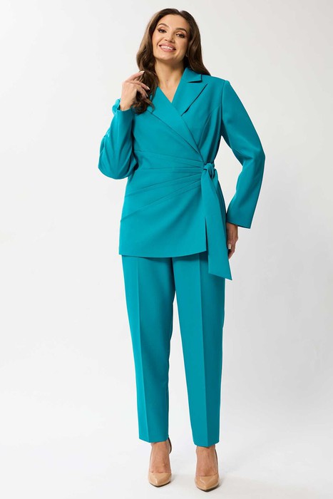 Костюм женский состоит из жакета и брюк. Жакет двубортный,  выполнен с акцентом на асимметричный крой: диагональные вытачки плавно переходят в декоративные складки, создавая интересный визуальный эффект и подчёркивая талию. Эффектно дополняет образ завязка, фиксирующая запах, что добавляет модели изысканности и динамичности. Жакет имеет классический отложной воротник. Спинка со средним швом и рельефами. Рукав втачной, одношовный. Брюки зауженные к низу, пояс на резинке и завязке. Боковые карманы. Жакет на подкладке.