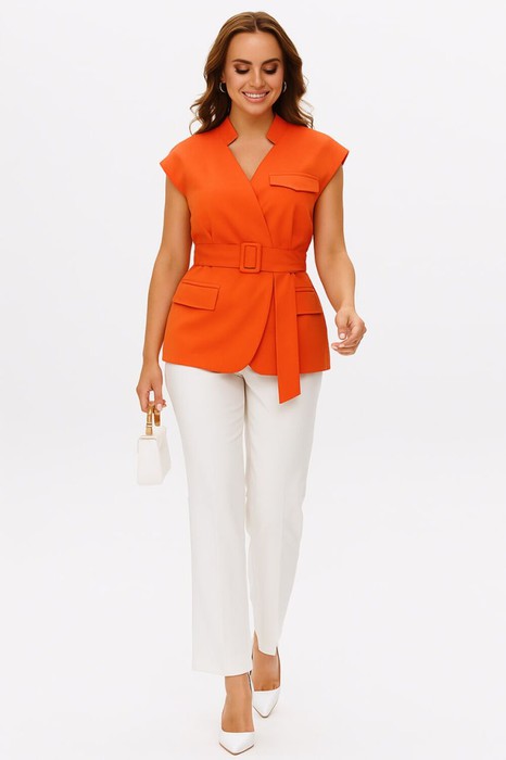 Комплект женский, состоит из блузы и брюк. Блуза свободного силуэта с центральной застежкой на 6 пуговиц. Борта и горловина обработана широкой планкой. Карманы в боковых швах. Рукав цельнокройный, по низу рукава и низу изделия настрочена декоративная тесьма. Брюки прямые на резинке со шнурком, свободные, прямые, с боковыми карманами. На боковые швы настрочена декоративная тесьма. Дополняет модель пояс.