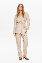 Женский брючный костюм, состоящий из жакета и брюк. Жакет полуприлегающего силуэта, двубортный, с застежкой на две пуговицы. Воротник английский. Рукав втачной, из кружевной ткани, заканчивается манжетой на пуговице. По бокам рельефные швы, формирующие силуэт. На уровне груди предусмотрены нагрудные вытачки. Брюки прямого силуэта, слегка зауженные к низу. Пояс частично на резинке (по бокам), с шлевками для ремня. Застежка на гульфик с молнией и внутренним крючком. По бокам боковые карманы с косым входом. Материал костюма костюмный, средней плотности, с гладкой фактурой. Без подкладки. Дополняет модель широкий пояс.