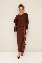 Юбка, зауженная к низу, на обтачке. Перёд с талевыми вытачками и центральным швом, который заканчивается разрезом. По заднему полотнищу талевые вытачки, центральный шов и застёжкой на потайную тесьму-молнию. От выточек до бокового шва вставлены резинки. Юбка на тонкой трикотажной подкладке. Украшает костюм отделочные строчки. Дополняет костюм пояс с пряжкой.