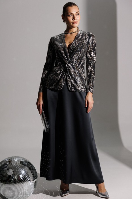 Продолжением нашей нарядной коллекции является роскошный комплект, состоящий из блузы, имитирующей жакет, и невероятной струящейся юбки из атласа длины макси. Блуза из ткани в пайетки с декоративным узлом в области талии. V-образный вырез. Блуза приталенного силуэта с втачными, двухшовными рукавами. Блуза частично на подкладке. Юбка на поясе с резинкой.