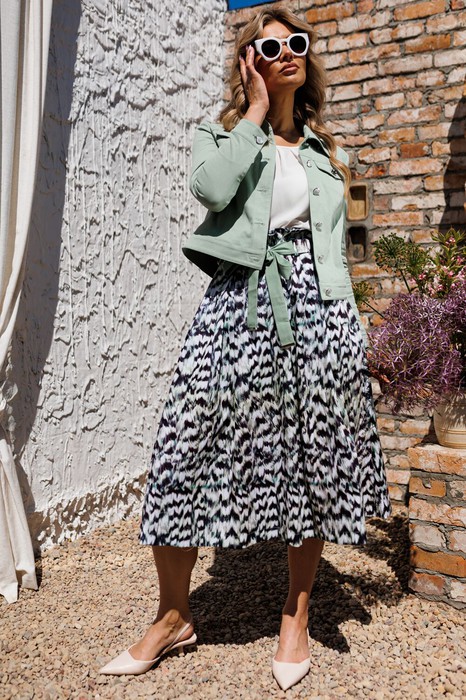 Комплект женский, состоящий из двух предметов : куртки в джинсовом стиле и юбки. Куртка полуприлегающего силуэта. Полочка с отрезной кокеткой, рельефными швами от кокетки до низа куртки. Спинка с отрезной кокеткой и рельефными швами. По низу куртки идет притачная планка, которая на боковых швах украшена настрочными патами. Рукав втачной, двухшовный. Воротник притачной. Застежка центральная на металлические пробивные пуговицы. Подборт нижней планки, нижний манжет выполнен из однотонного отделочного материала. Рельефы кокетки, клапаны и воротник отстрочены двойной отделочной строчкой. Юбка силуэта "колокол" с завышенной линией талии. По верхнему краю юбки, который обработан подкройной обтачкой, заложены встречные складки. В боковых швах юбки -  карманы. На уровне складок по линии талии настрочены шлевки. Декором юбки является объемный пояс, который украшен металлическими деталями.